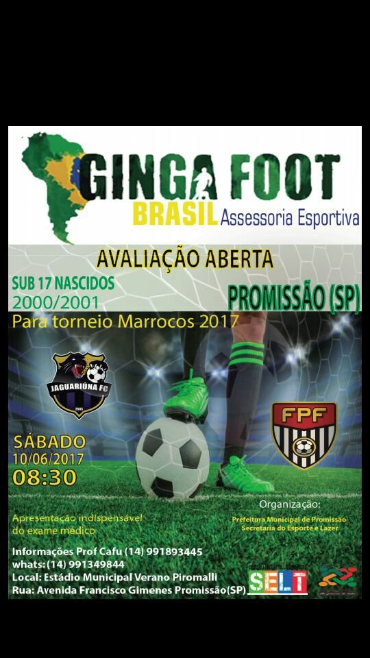 A Ginga Foot Brasil realizou, no dia 10 de junho de 2017, uma peneira de futebol na cidade de Promissão, interior de São Paulo. Foram avaliados jogadores sub 17 nascidos em 200 e 2001. Os selecionados disputarão torneio no Marrocos. A organização do evento foi realizada pela Prefeitura Municipal de Promissão através da Secretaria de Esporte e Lazer. O local da Avaliação Técnica foi no Estádio Municipal Verano Piromalli situado na Avenida Francisco Gimenes Promissão. Fique atento aqui, no site, às novidades sobre quais jogadores foram selecionados.